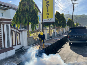 Tribratanewsacehselatan – Guna mengantisipasi dan mencegah penyebaran penyakit Demam Berdarah Dengue (DBD), Polres Aceh Selatan bekerja sama dengan Tim Fogging dari Biddokkes Polda Aceh melaksanakan kegiatan pengasapan (fogging) di lingkungan Mapolres, Polsek jajaran, serta seluruh asrama personel Polres Aceh Selatan. Kegiatan ini dilaksanakan mulai pukul 08.30 WIB hingga selesai, Senin, 13 Oktober 2025.