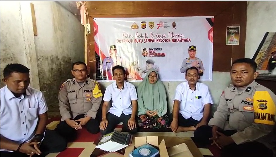 Polsek Meukek membagikan buku kepada anak-anak Taman Pendidikan Al-Quran (TPA) Aron Tunggai Kecamatan Meukek Kabupaten Aceh Selatan sebagai bagian dari program “Polri Peduli Budaya Literasi.”